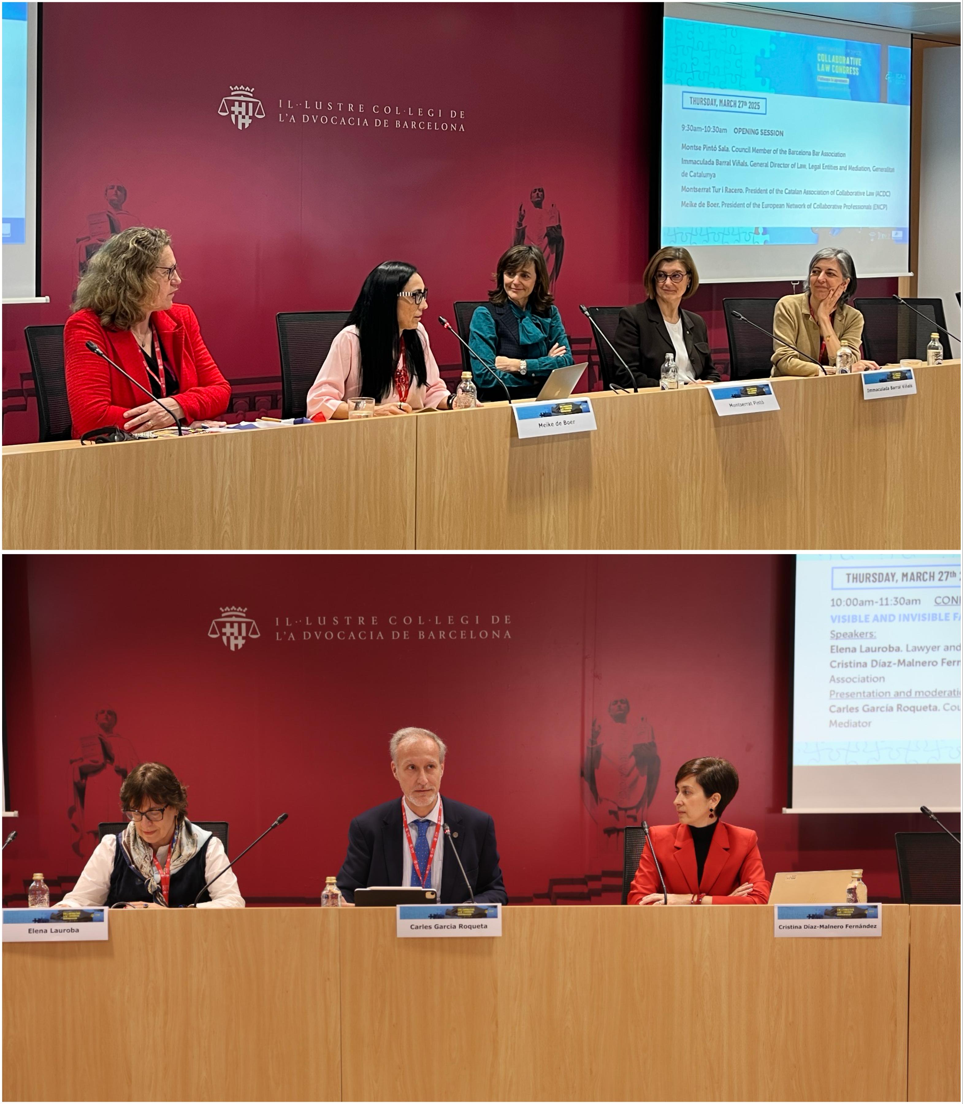 El congrés s’ha iniciat amb una conferència sobre els eixos visibles i invisibles de la resolució col·laborativa, que ha comptat amb la participació d’Elena Lauroba, advocada, secretària de l'ACDC, catedràtica de Dret Civil i vicerectora de la Universitat de Barcelona i Cristina Díaz-Malnero, presidenta de la Secció de Dret de Família de l'ICAB. Durant la sessió s’ha fet èmfasi en la “Transparència, el respecte i la confiança” com a valors essencials que han regir la pràctica del dret col·laboratiu, una manera de resolució de conflictes on preval la cooperació entre les parts i els seus advocats amb l’objectiu de cercar una solució integral que satisfaci els interessos i veritables necessitats de les parts, reservant la via judicial per atorgar eficàcia a l'acord, o bé, quan el procediment col·laboratiu no s'ha aconseguit.