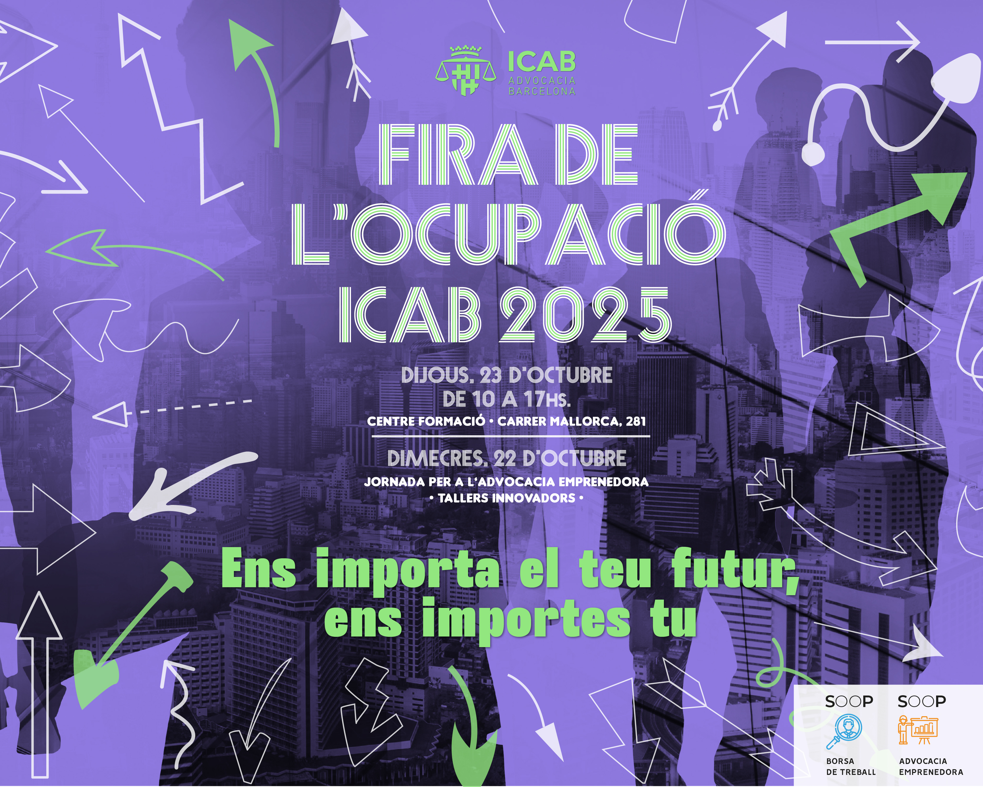 El Col·legi de l'Advocacia de Barcelona (ICAB) celebrarà el pròxim 23 d'octubre de 2025 la Fira de l’Ocupació 2025 amb el lema “Ens importa el teu futur, ens importes tu”. Aquest esdeveniment, que tindrà lloc al Centre de Formació de l’ICAB (Mallorca 281), s'ha consolidat com un dels principals punts de connexió entre estudiants de dret, joves advocats i despatxos professionals, té com a objectiu facilitar l'accés al mercat laboral i fomentar el desenvolupament de noves oportunitats professionals en l'àmbit jurídic