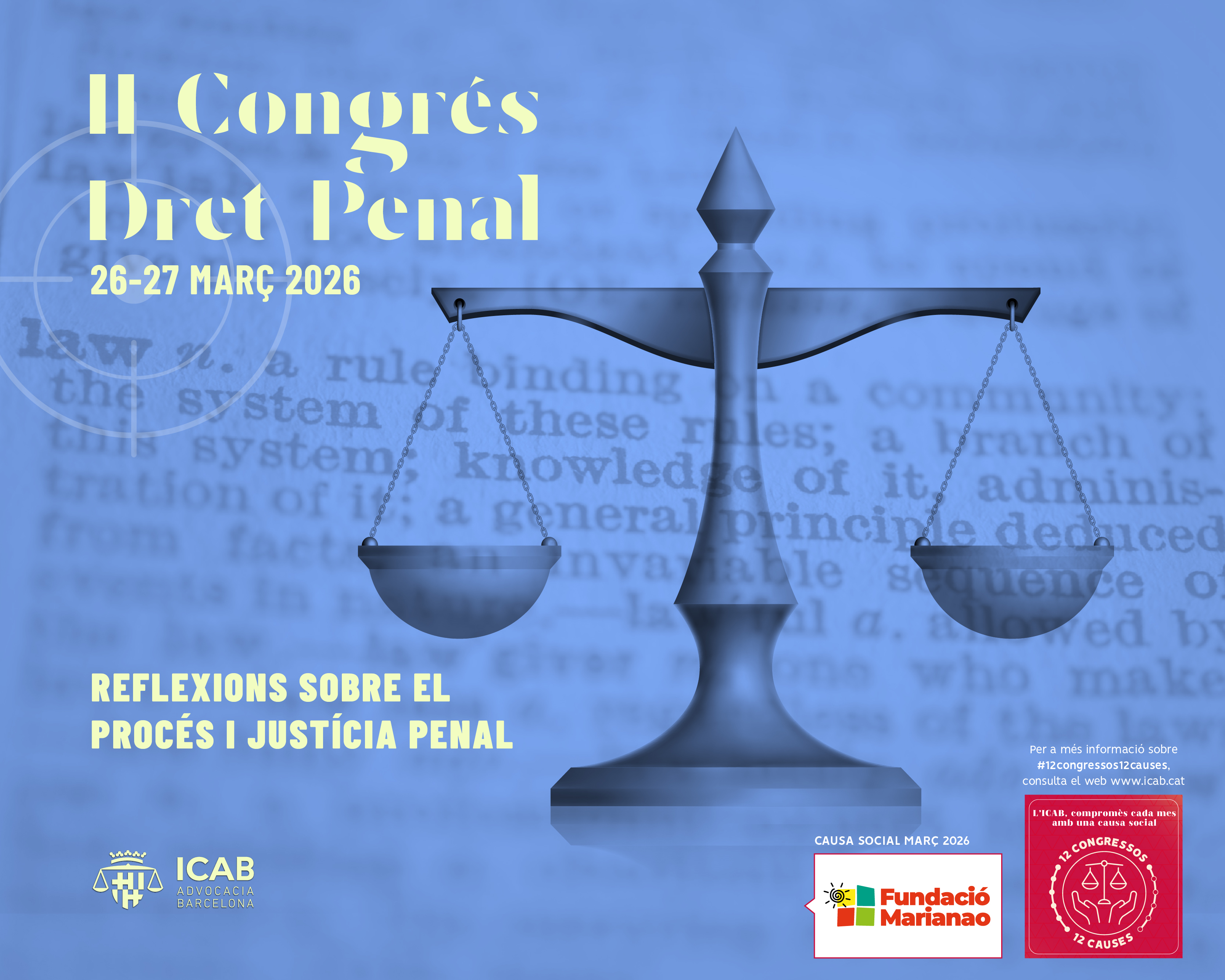 L’Il·lustre Col·legi de l’Advocacia de Barcelona obre les inscripcions per al II Congrés de Dret Penal. Reflexions sobre el Procés i Justícia Penal, que se celebrarà els dies 26 i 27 de març de 2026 en format presencial i també en línia. La trobada està organitzada per la Secció de Dret Penal de l’ICAB i reunirà professionals de l’àmbit jurídic per analitzar qüestions d’actualitat relacionades amb el procés penal i la justícia penal.