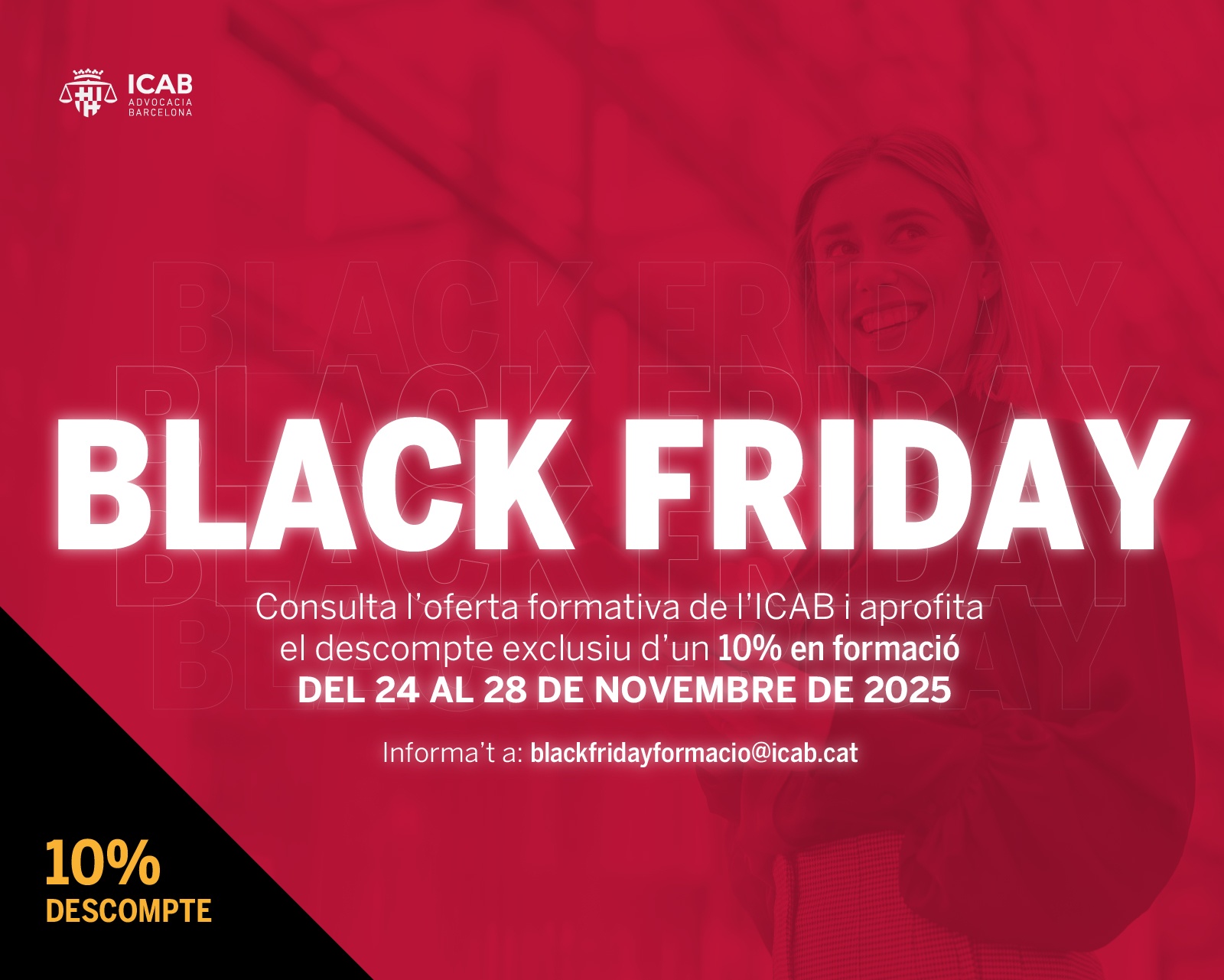 Arriba una promoció que no et pots perdre! A l’ICAB t’oferim facilitats per formar-te amb nosaltres: durant la setmana del 24 al 28 de novembre de 2025, aprofita el nostre descompte Black Friday del 10% en tota la nostra oferta formativa.
