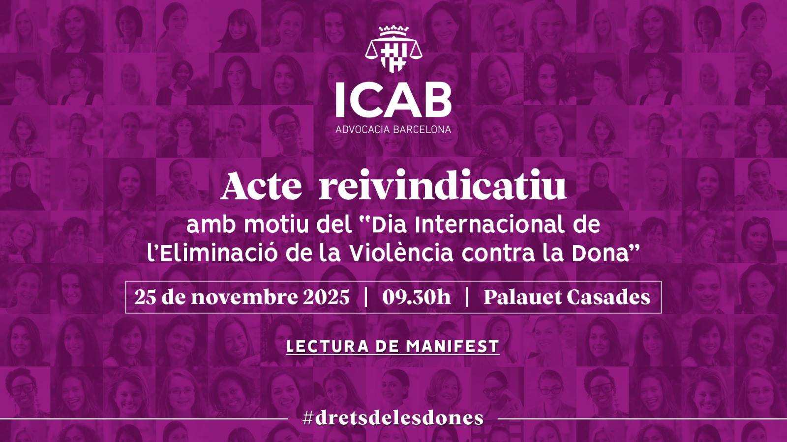 CONVOCATORIA: El ICAB presenta los datos de actuaciones de oficio en VIGE y violencia machista de los primeros diez meses de 2025 en el marco del “Día Internacional de la Eliminación de la Violencia contra la Mujer”