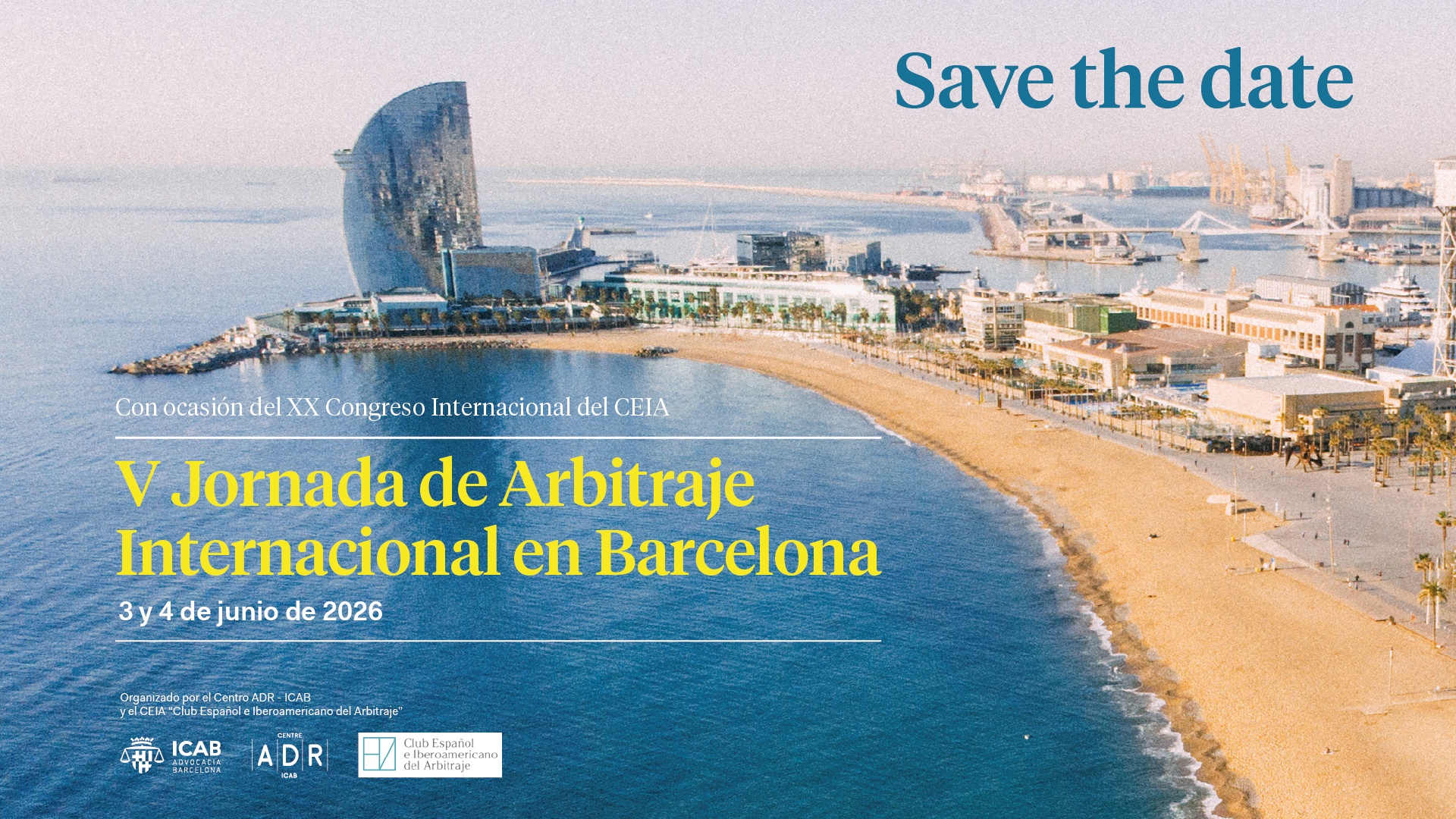 El Ilustre Colegio de la Abogacía de Barcelona (ICAB) organiza, junto con el Centro ADR-ICAB y el Club Español e Iberoamericano del Arbitraje (CEIA), los días 3 y 4 de junio de 2026, la V Jornada de Arbitraje Internacional en Barcelona.