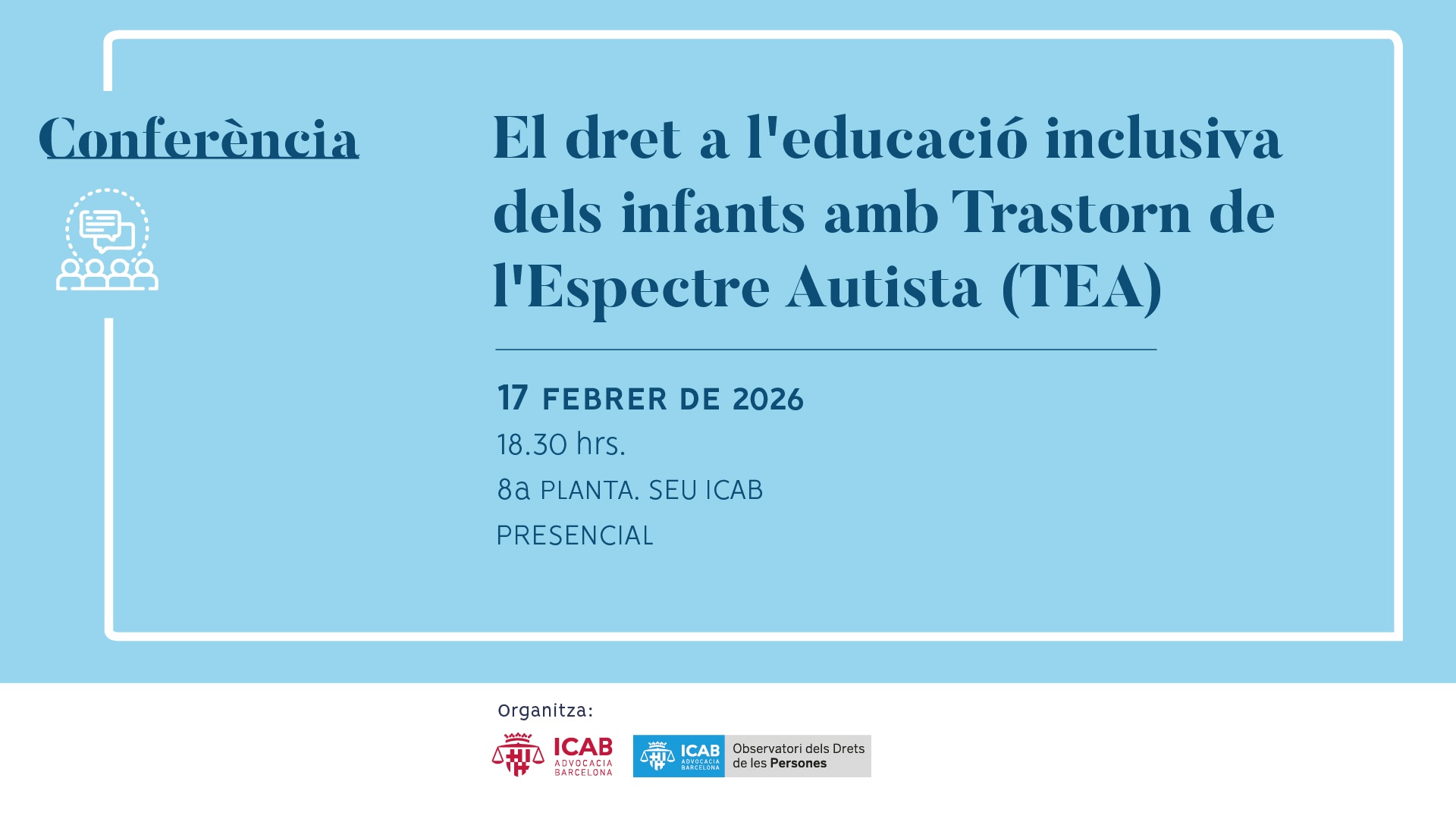 El pròxim 17 de febrer de 2026, a les 18.30 h, l’Il·lustre Col·legi de l’Advocacia de Barcelona (ICAB) acollirà la conferència ‘El dret a l’educació inclusiva dels infants amb Trastorn de l’Espectre Autista (TEA)’, una sessió organitzada per l’Observatori dels Drets de les Persones de l’ICAB. La trobada vol posar el focus en els reptes jurídics i socials que encara condicionen l’accés real a una educació inclusiva, així com en les mesures de suport necessàries per evitar situacions d’exclusió educativa.
