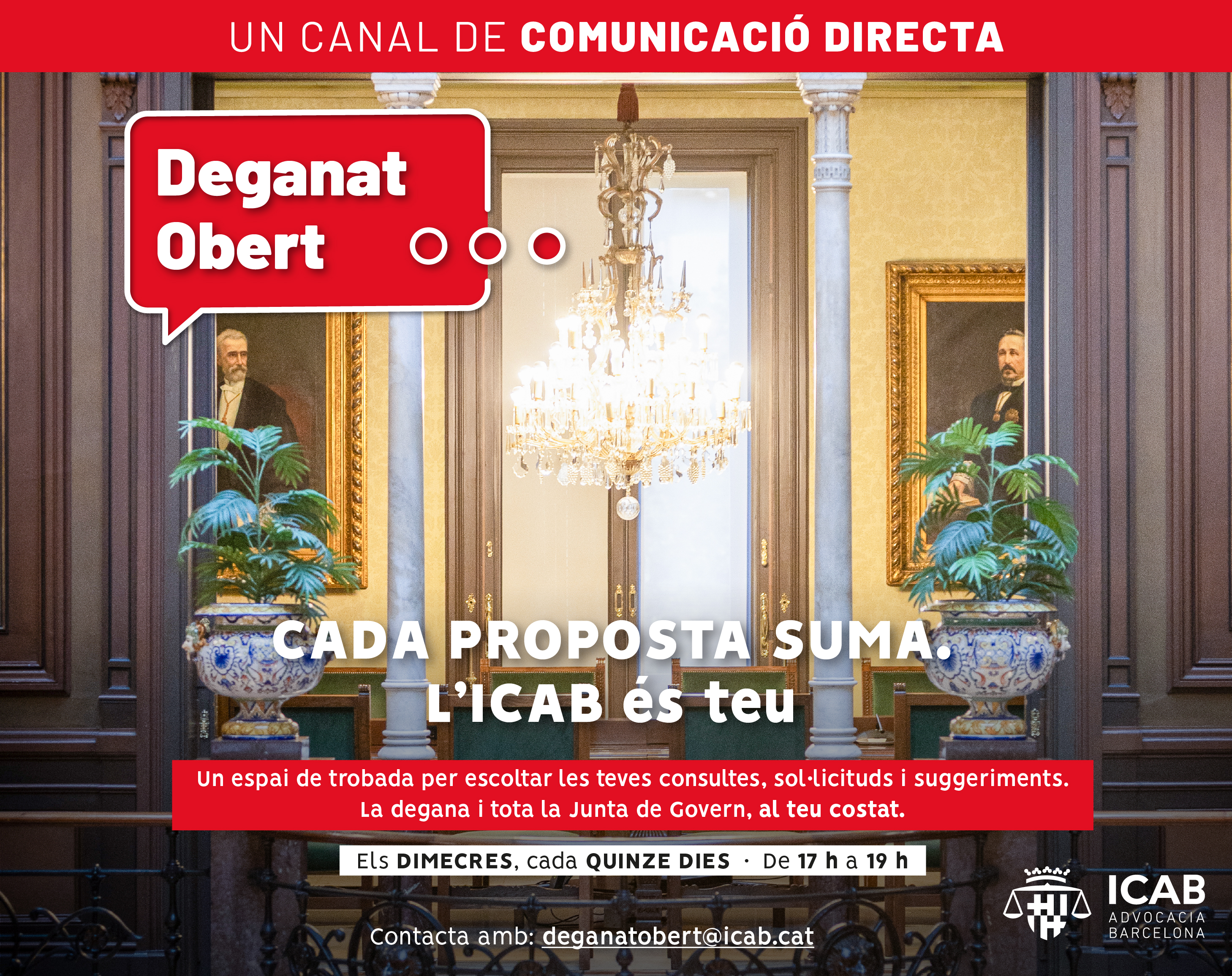 L’Il·lustre Col·legi de l’Advocacia de Barcelona (ICAB) impulsa el “Deganat Obert”, un nou canal de comunicació directa amb les persones col·legiades. A través d’aquesta iniciativa, la degana, Cristina Vallejo, juntament amb els diputats i diputades de la Junta de Govern estaran a disposició dels col·legiats i col·legiades per atendre les seves consultes, propostes, sol·licituds o suggeriments.