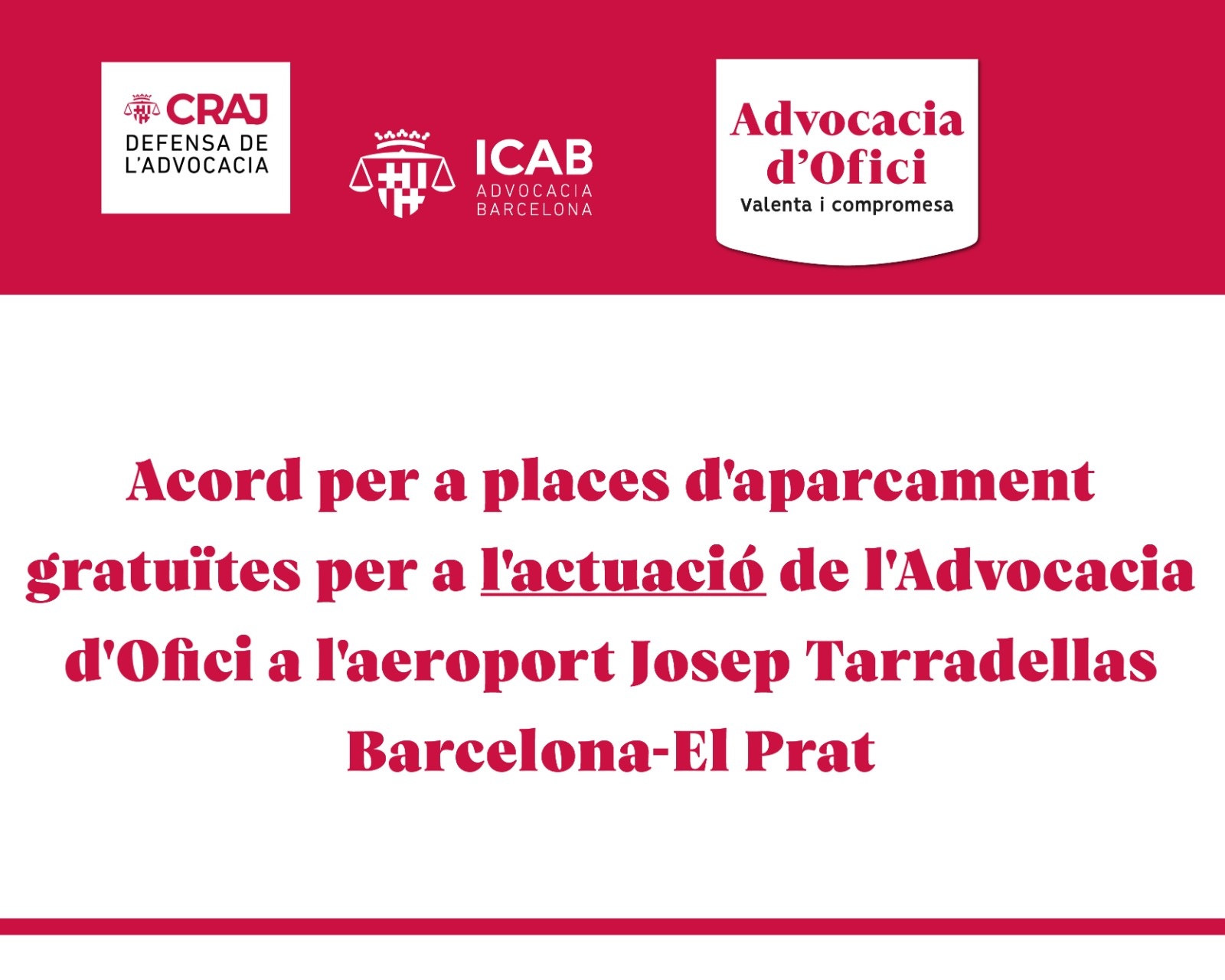 La Junta de Gobierno del Colegio de la Abogacía de Barcelona (ICAB) ha logrado un acuerdo con los Mossos d'Esquadra para que los abogados y abogadas del Turno de Oficio puedan disponer de aparcamiento gratuito en el aeropuerto Josep Tarradellas Barcelona - El Prat durante sus actuaciones. Ésta era una reivindicación histórica de la Corporación para los compañeros y compañeras adscritos al Turno.