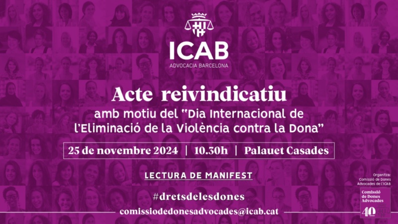 Con motivo del 'Día Internacional de la Eliminación de la Violencia Contra la Mujer', el Colegio de la Abogacía de Barcelona (ICAB) realizará el próximo lunes, 25 de noviembre de 2024, a las 10.30 h, un acto reivindicativo para visibilizar y denunciar la violencia contra mujeres y niñas.