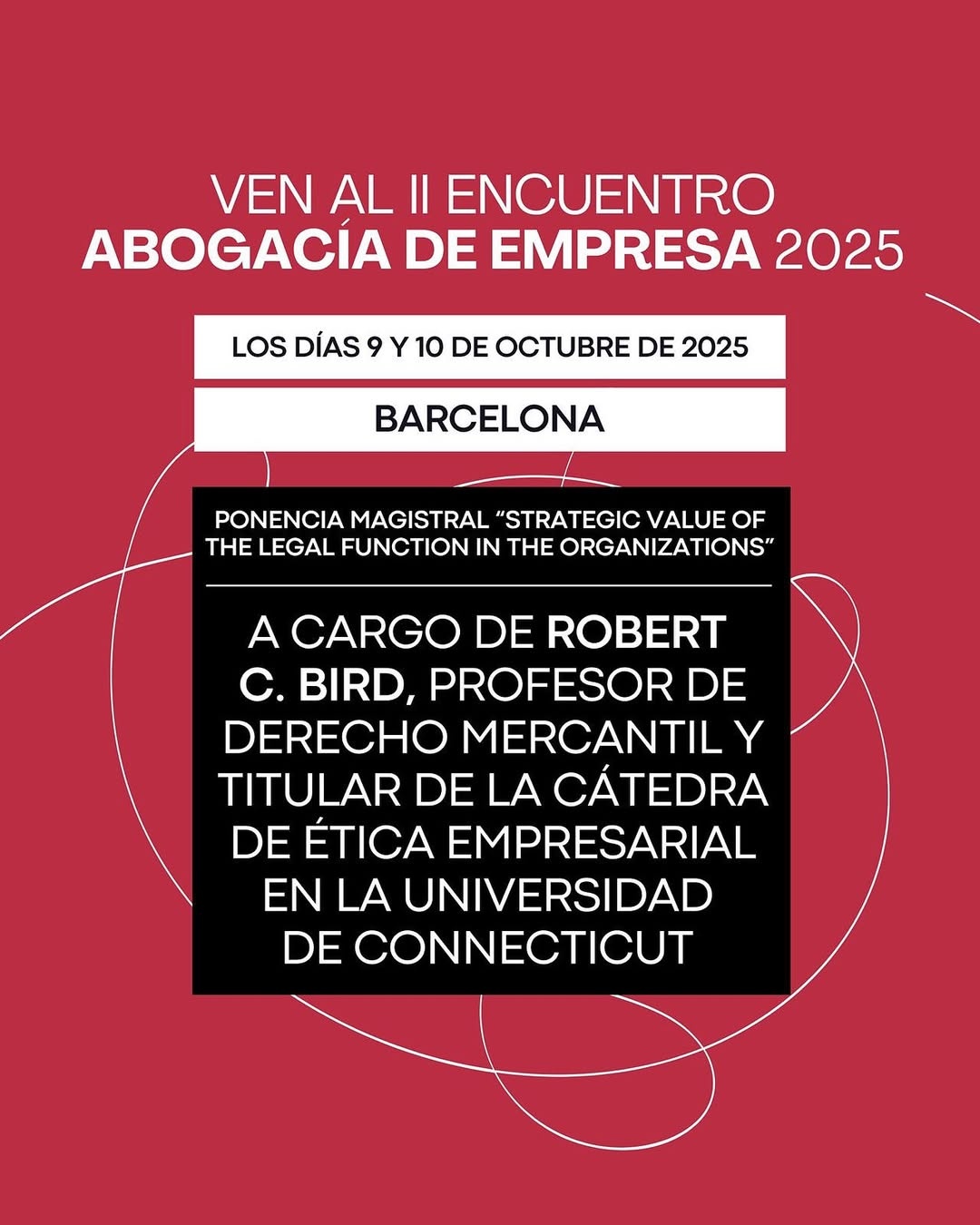 El Encuentro se iniciará con una ponencia magistral a cargo de Robert C. Bird, autor de Legal Knowledge in Organizations: A Source of Strategic and Competitive Advantage, y figura clave en el análisis de la función legal como ventaja competitiva. Su intervención marcará el tono estratégico de este evento.
