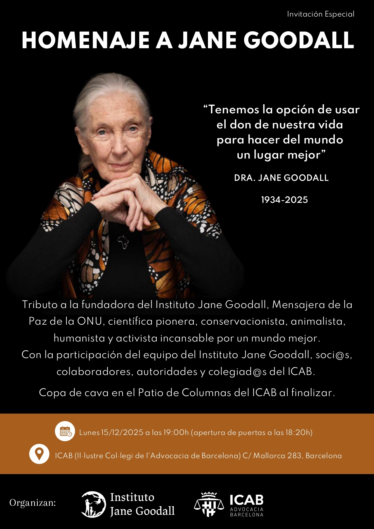 El Instituto Jane Goodall España (IJGE), en colaboración con el Ilustre Colegio de la Abogacía de Barcelona (ICAB), organiza un homenaje a la reconocida etóloga, conservacionista y activista británica Jane Goodall, fallecida el pasado 1 de octubre. El acto se celebrará el lunes 15 de diciembre, a las 19:00 h, en el ICAB, y contará con la participación de destacadas personas con las que la Dra. Goodall estuvo vinculada o mantuvo una estrecha relación.